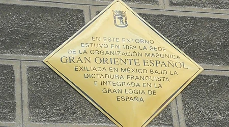 La placa explica: “En este entorno estuvo en 1889 la sede de la organización masónica Gran Oriente Español, exiliada en México bajo la dictadura franquista e integrada en la Gran Logia de España”.